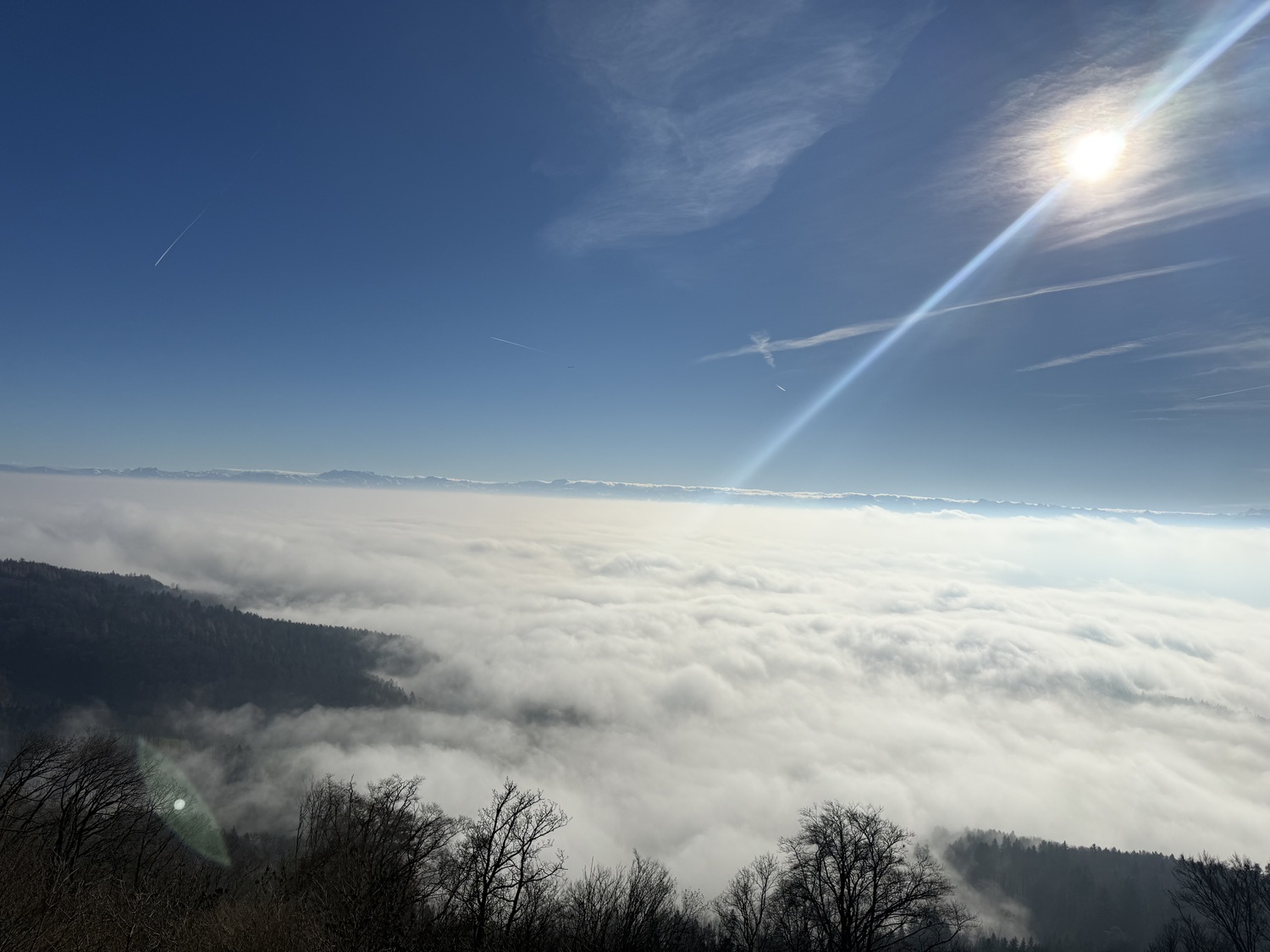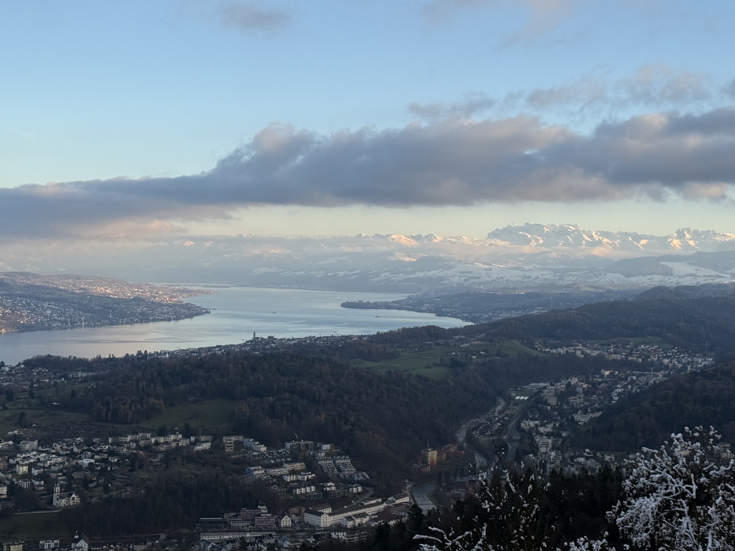 View of Zurich, Zürichsee, and Alps from atop Uetliberg