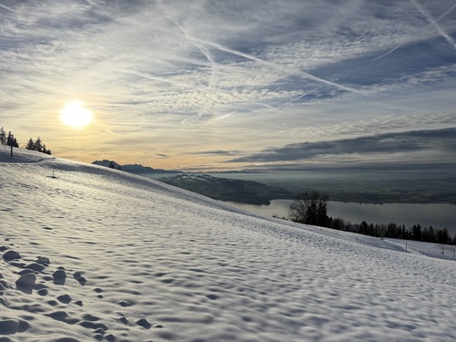View from low slopes of Zugerberg of Zugersee, Zug, and the Alps
